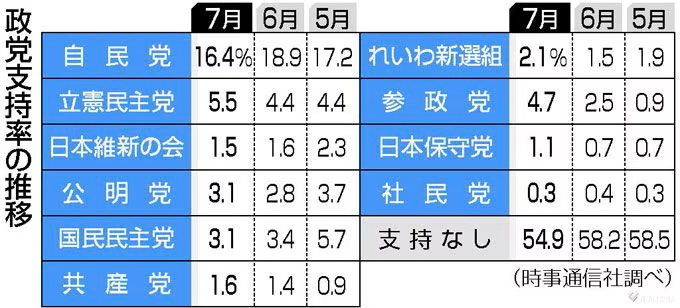 最新世論調査で石破自民党の支持率が過去最低更新16.4% 立憲5.5% 参政4.7% 国民3.1% 公明3.1% れいわ2.1% 共産1.6% 維新1.5% 日保1.1%